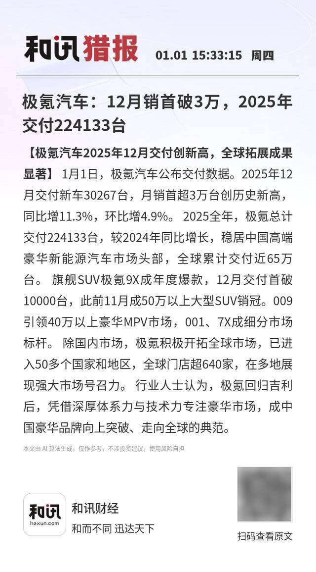 极氪汽车近日公布了其最新交付数据,展现出强劲的市场表现。在2025年12月,极氪交付新车数量达到30267台,首次突破月销3万台大关,创下历史新高。这一成绩不仅较上月环比增长4.9%,更实现了同比11.3%的显著增长,彰显了品牌在高端新能源汽车市场的竞争力。