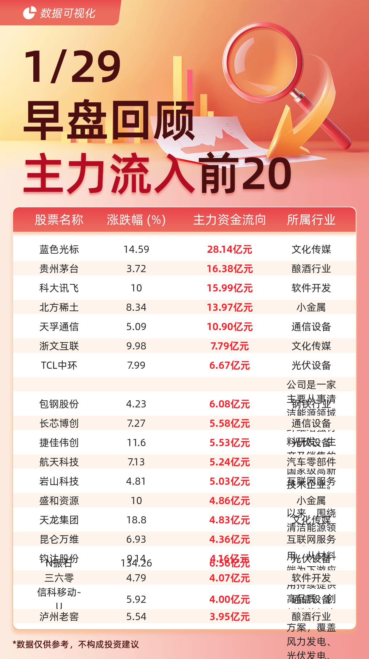 根据交易所最新披露的数据,1月29日午间收盘前,A股市场主力资金呈现显著分化格局。以蓝色光标、贵州茅台、科大讯飞为代表的20只个股成为资金追逐焦点,其中蓝色光标以28.14亿元净流入额位居榜首,较第二名贵州茅台高出近12亿元,形成明显断层优势。