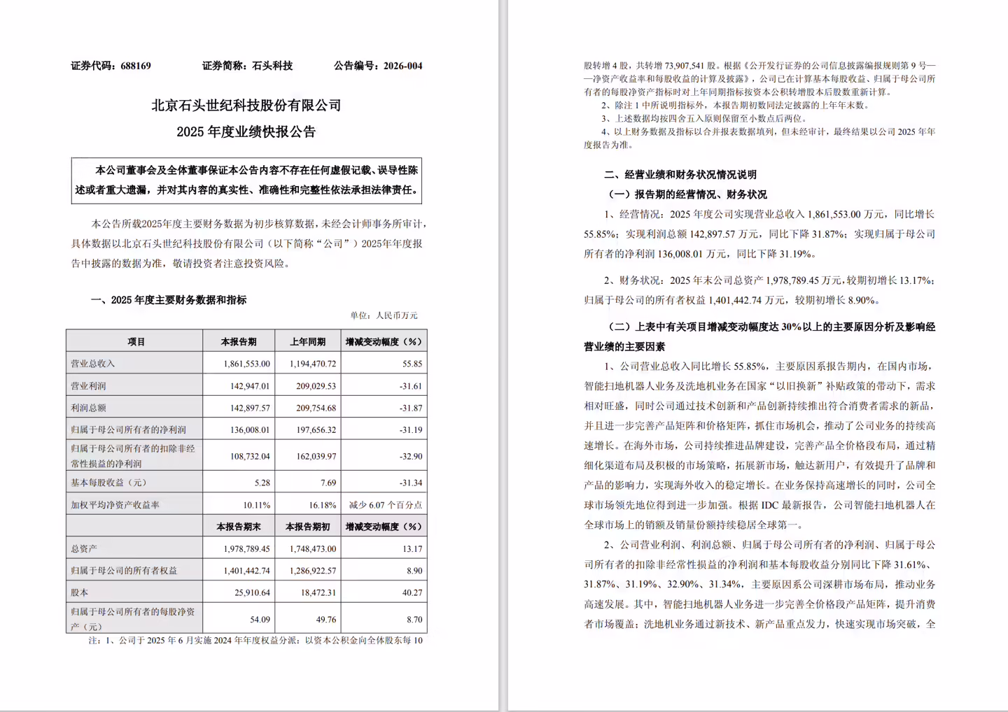 石头科技近日披露的2025年度业绩快报显示,公司全年实现营业总收入186.16亿元,较上年同期增长55.85%,展现出强劲的市场扩张能力。尽管归母净利润同比下降31.19%至13.6亿元,但公司通过战略布局调整,在智能清洁领域持续巩固行业地位。基本每股收益5.28元的数据,反映出公司在规模扩张与盈利能力平衡方面的阶段性特征。