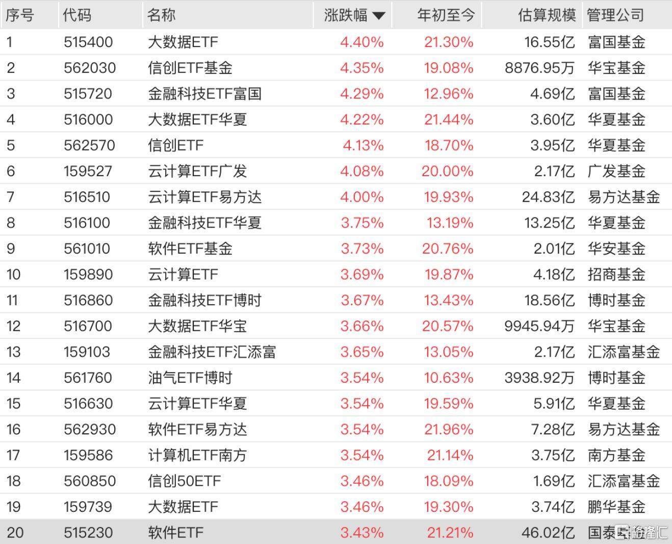 A股市场今日波动显著,AI相关板块成为领涨主力。多只ETF产品表现亮眼,大数据ETF、信创ETF基金、金融科技ETF富国等涨幅均超过4%,云计算主题ETF也集体走强,广发、易方达旗下产品涨幅居前。