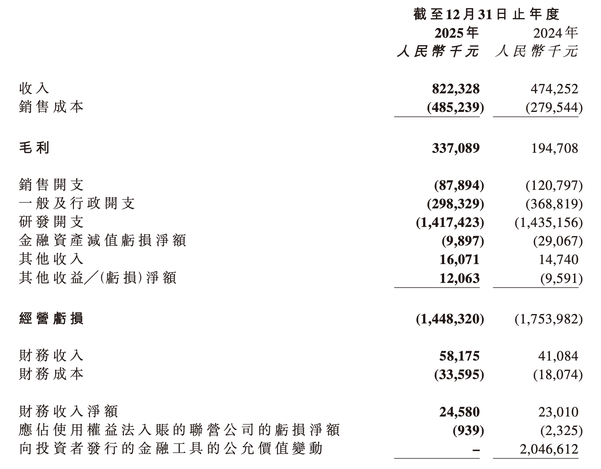 费用控制方面呈现分化态势。销售开支同比下降27.2%至8789.4万元,一般及行政开支减少19.1%至2.98亿元,但研发开支仍维持在14.17亿元的高位,占营收比例超过170%。这种"高投入"策略导致公司全年经营亏损14.48亿元,不过经调整净亏损较上年收窄17.5%至10.76亿元,反映出经营效率的边际改善。